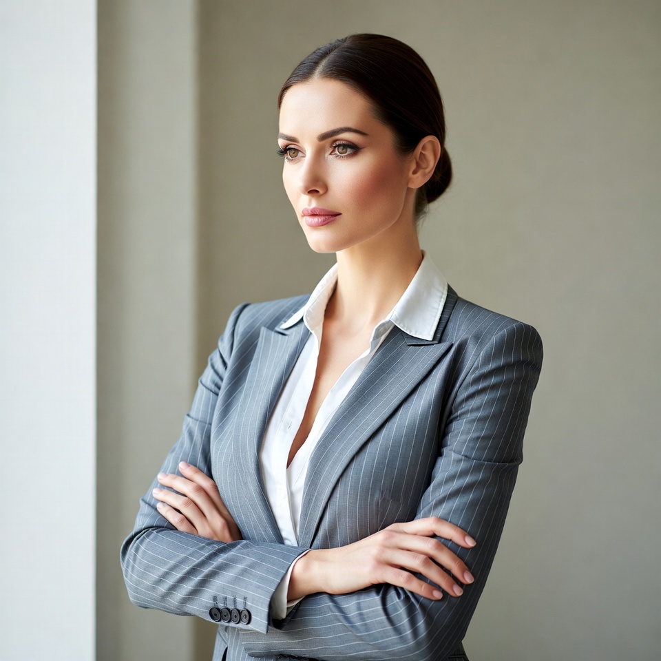 A woman with long dark hair in a bun stands with arms crossed in front of a large window. She wears a gray pinstripe blazer over a white collared blouse with subtle cleavage. Her expression is confident as she gazes sideways in an office setting with beige walls.