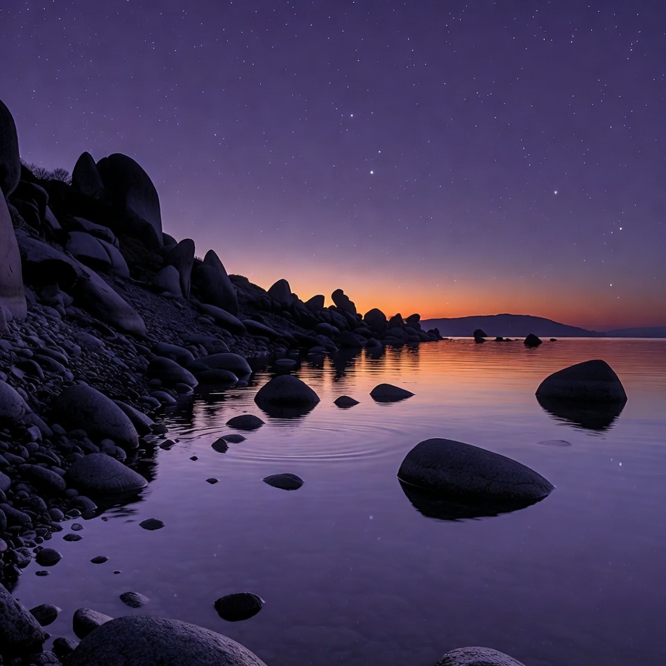 Large smooth boulders line the edge of a calm lake during twilight with a purple starry sky. The water reflects the sunset hues and scattered rocks. Gentle ripples disturb the mirrored surface near the foreground stones.