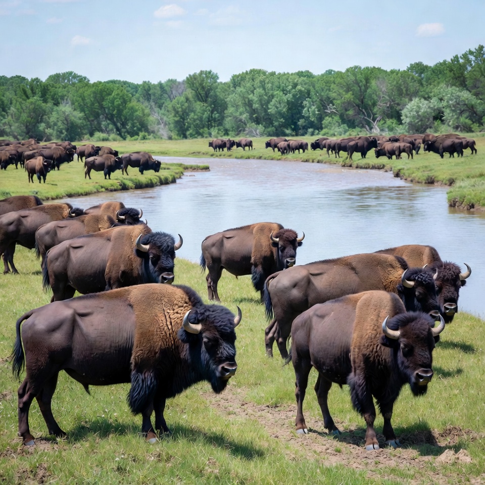 A large herd of American bison stands and grazes on green grassy plains near a winding river. Shaggy brown bison with curved horns are gathered in groups along the water's edge and scattered across the field. Lush green trees line the background under a partly cloudy sky.