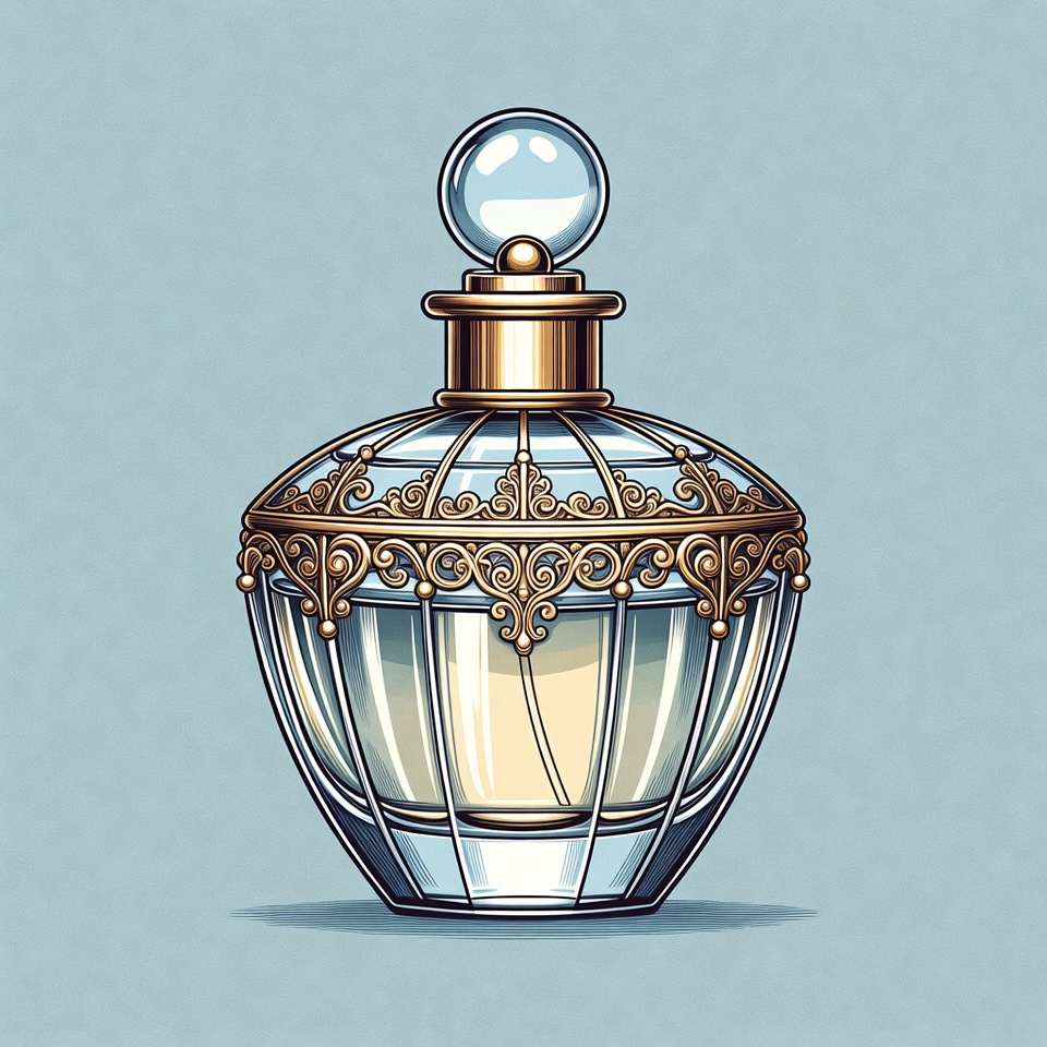 beauty product, clear glass, clipart, decorative bottle, elegant bottle, fashion accessory, fragrance bottle, glass bottle, gold cap, gold filigree, graphic design, illustration, isolated background, luxury perfume, ornate design, perfume, vector art, vintage style, yellow liquid, perfume bottle