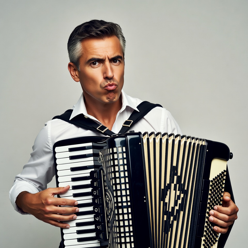 A middle-aged man with short gray hair and a white shirt stands against a plain gray background, holding and playing a black accordion strapped over his shoulders. He makes a playful pouting expression with pursed lips and raised eyebrows. His hands are positioned on the keyboard and bellows of the instrument.