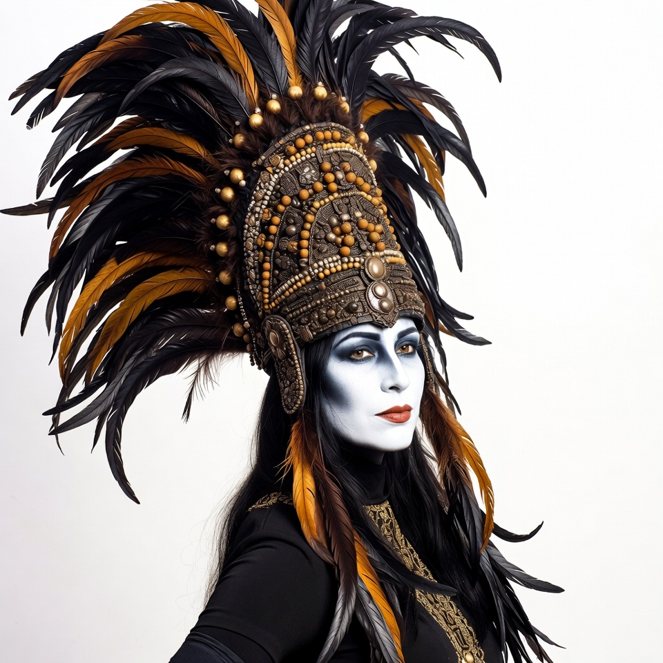 Aztec headdress, Indigenous, black feathers, black outfit, costume, cultural costume, dramatic makeup, feather headdress, feathers, female, gold beads, indigenous headdress, isolated background, makeup, orange feathers, ornate headdress, portrait, red lips, tribal headdress, white face paint, woman