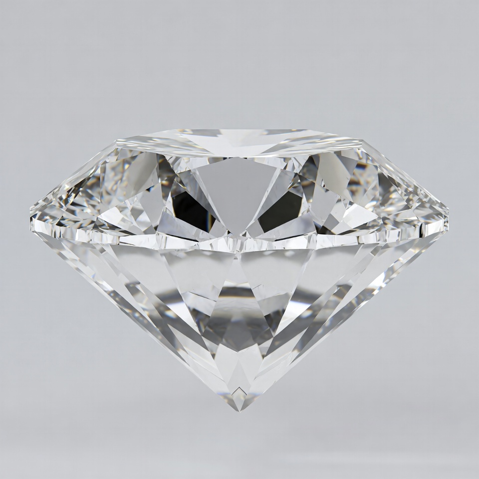 A large, clear diamond gemstone with brilliant facets is centered against a plain gray background. The diamond features a classic round brilliant cut, showcasing multiple reflective surfaces and sharp edges. Light refracts through the stone, creating sparkling highlights.