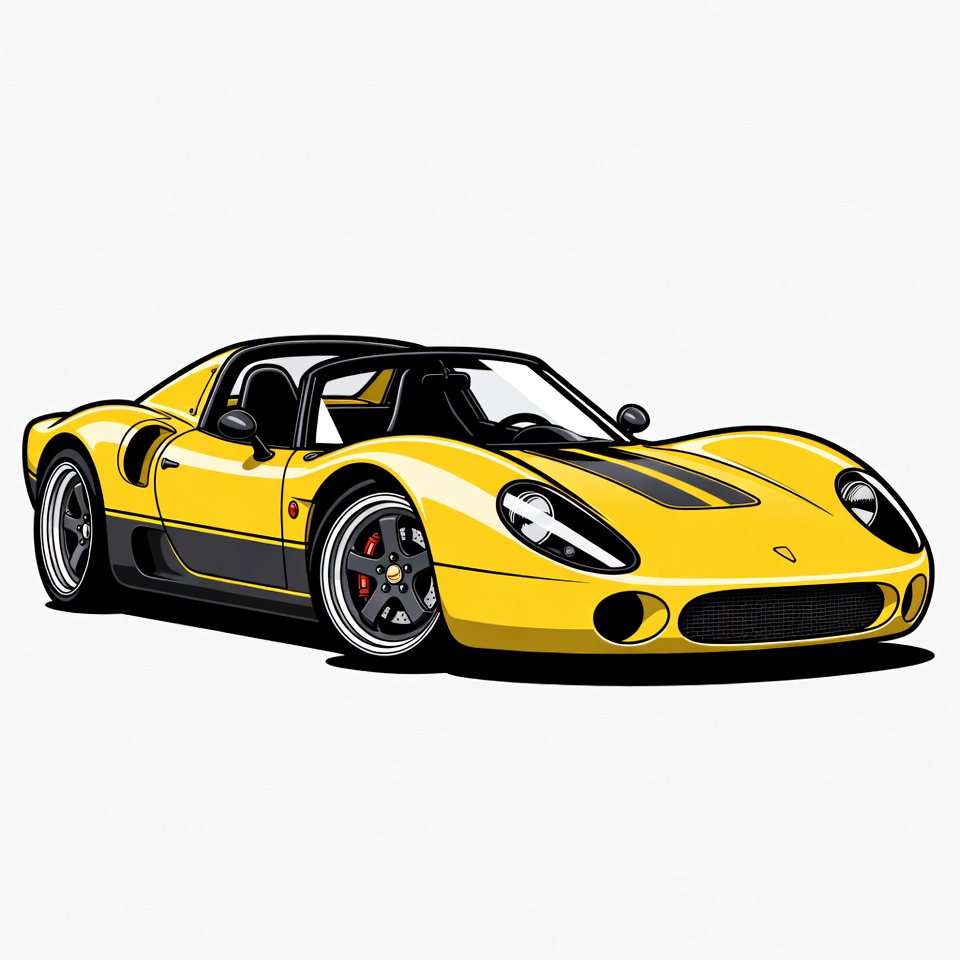 alloy wheels, automotive art, black stripes, car design, classic car, clipart, headlights, illustration, isolated background, luxury car, mid-engine, open cockpit, race car, sports car, supercar, vector art, yellow Porsche, yellow car, Porsche