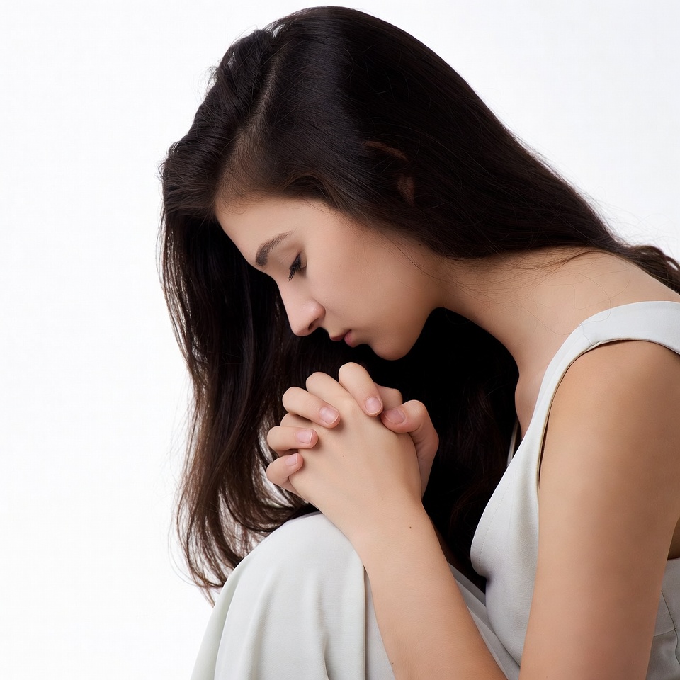 A young Asian woman with long black hair kneels on a white background, her head turned downward in a thoughtful pose. She wears a white sleeveless dress and clasps her hands together in a prayer gesture. Her eyes are gently closed, with hair cascading over her shoulders.