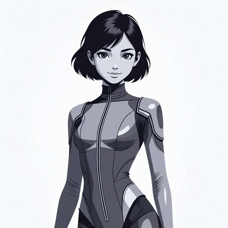 A black and white anime illustration features a young woman with short bob haircut and large expressive eyes. She wears a sleek, form-fitting futuristic bodysuit with high collar, zippered front, and angular shoulder pads. She stands confidently against an isolated white background.