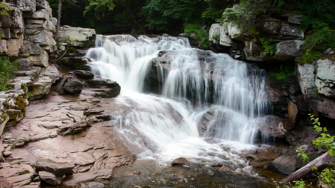 boulders, cascade, cliff, environment, falls, flow, foliage, forest, green trees, greenery, landscape, lush, mossy rocks, natural, nature, outdoors, pool, river, rocks, scenery, stone, stream, tiered waterfall, vegetation, water, woods, waterfall