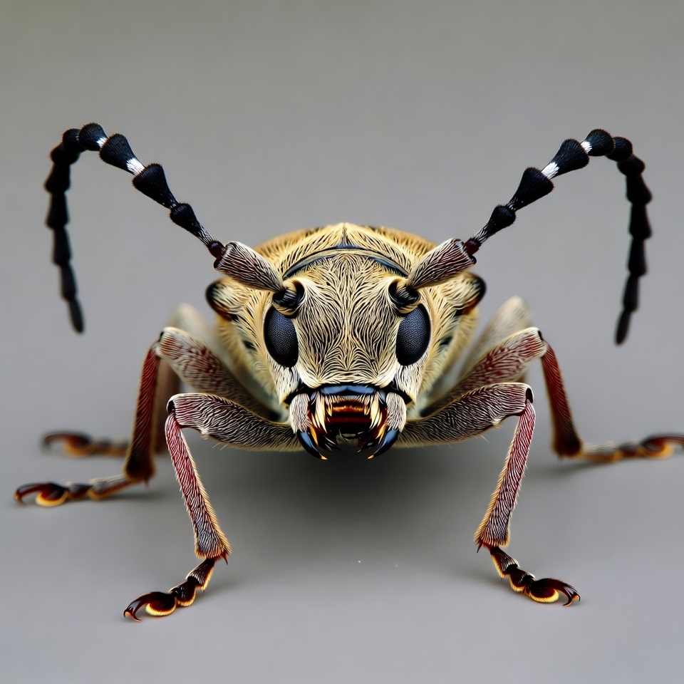 antennae, arthropod, beetle, black legs, brown beetle, bug, close-up, compound eyes, detailed insect, golden body, insect, isolated background, long antennae, macro photography, mandibles, nature, wildlife, longhorn beetle