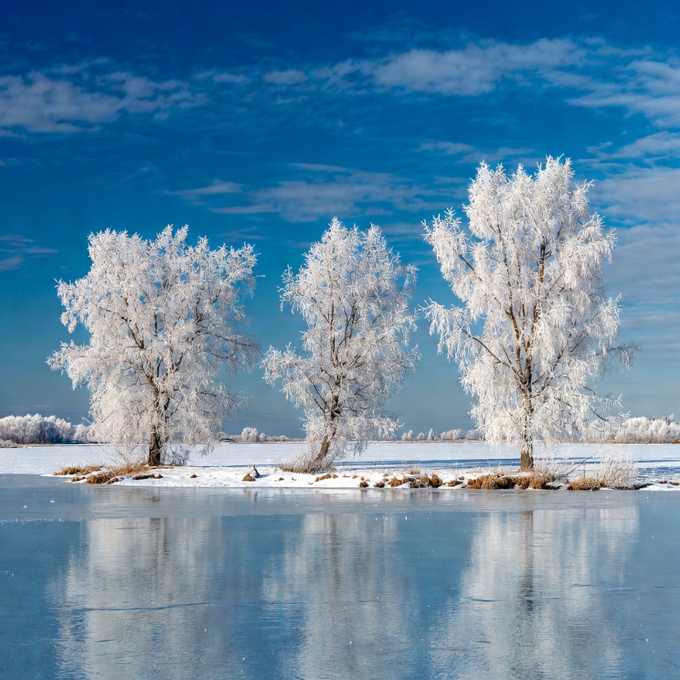 Three trees with branches covered in white frost stand on a snowy island surrounded by a frozen lake. Their reflections are visible in the smooth ice surface under a clear blue sky with scattered clouds. Snow blankets the ground and nearby landscape.