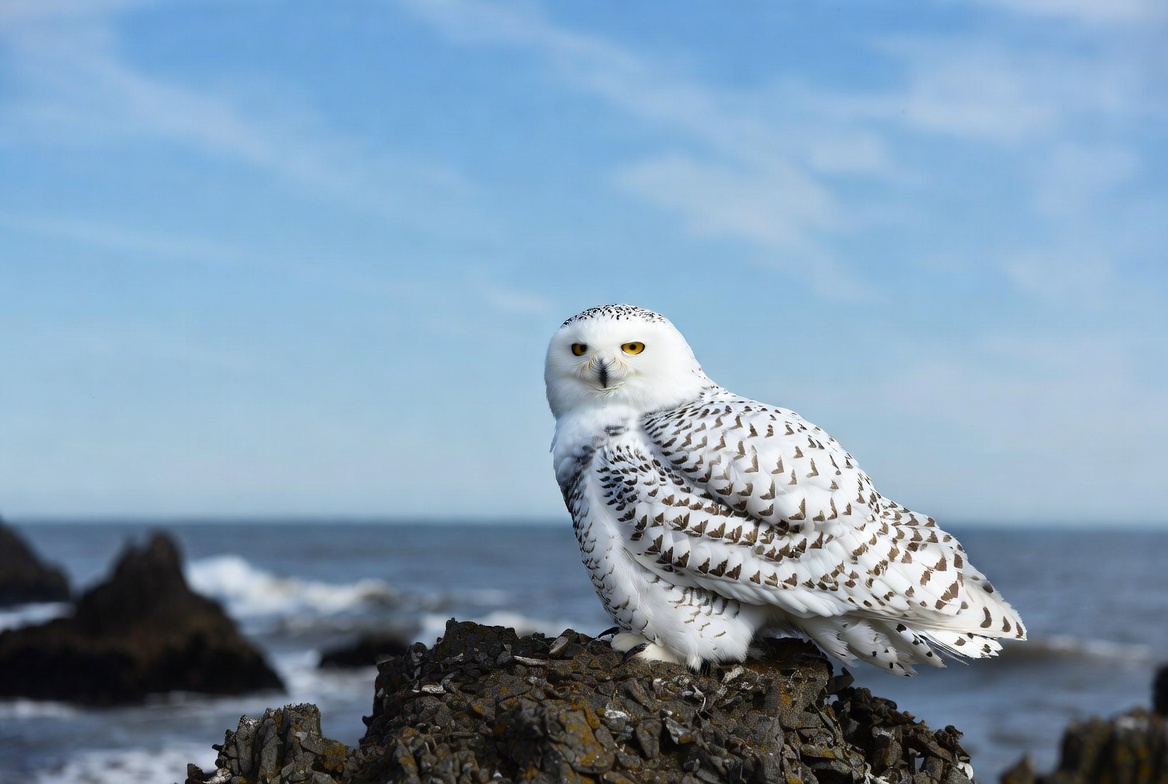 animal, bird, blue sky, feathers, isolated background, nature, ocean, owl, perched, rocks, rocky outcrop, seashore, waves, white owl, wildlife, yellow eyes, snowy owl