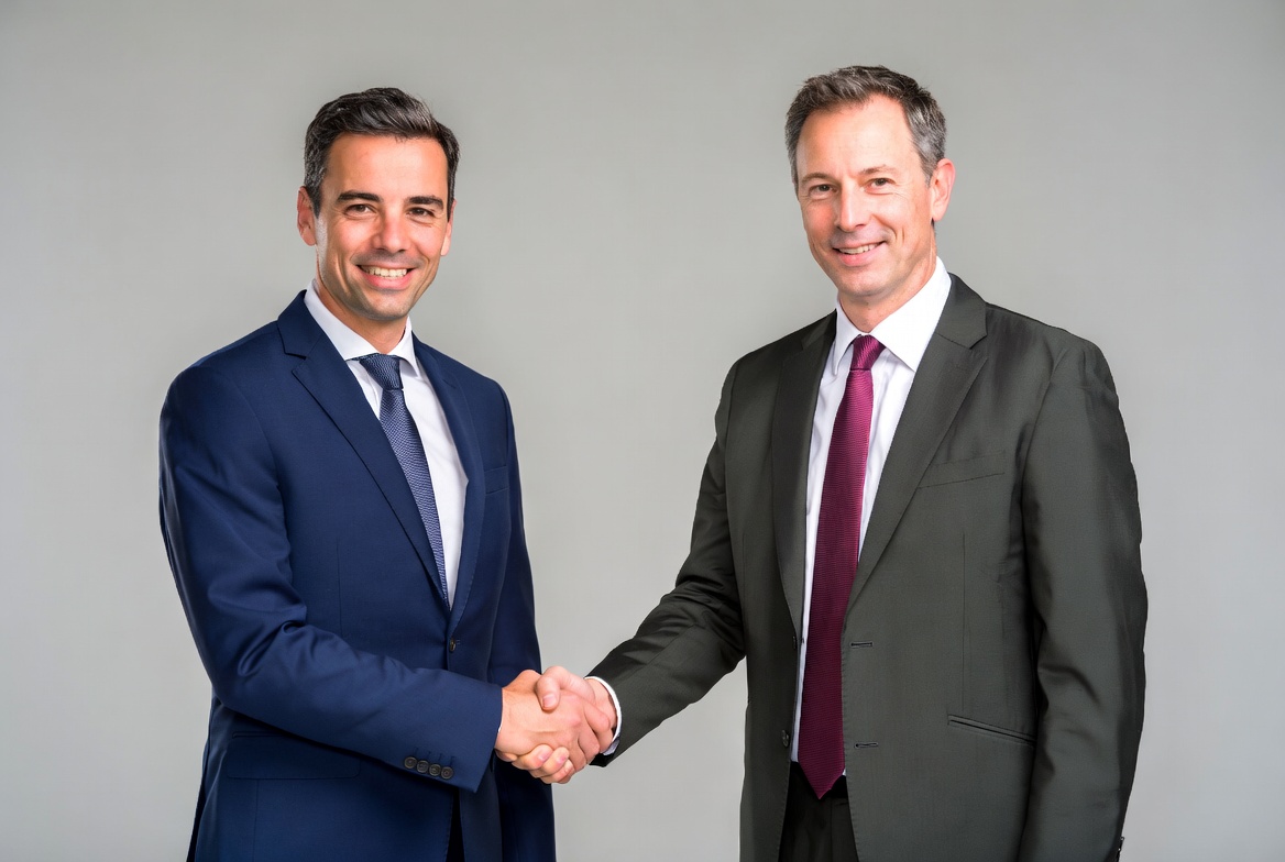 Two middle-aged White men in business suits shake hands firmly against a plain gray background. The man on the left wears a navy blue suit with a light blue tie and smiles confidently. The man on the right wears a dark gray suit with a red tie and also smiles.