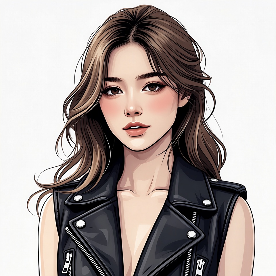 A young Asian woman with long wavy brown hair gazes forward with a subtle smile. She wears a black leather vest with silver zippers that reveals cleavage. The digital illustration features her on a plain white background.