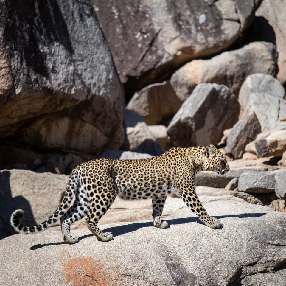 animal, big cat, boulders, feline, nature, outdoors, paw, predator, rocks, rocky terrain, safari, spotted fur, stone, sunny, tail, walking, wildlife, leopard