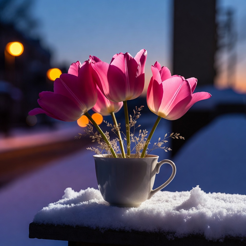 blue sky, bokeh lights, bouquet, city lights, cold weather, dusk, floral arrangement, flowers, grasses, outdoor, snow, snowy surface, stems, tulips, twilight, vibrant flowers, white cup, winter, wooden table, pink tulips