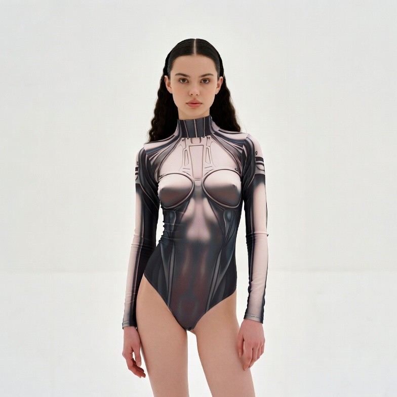 black accents, cyberpunk style, dark hair, fashion, female, futuristic bodysuit, gray bodysuit, high collar, isolated background, long sleeves, metallic outfit, posing, sci-fi clothing, shiny fabric, standing, wavy hair, young woman, woman