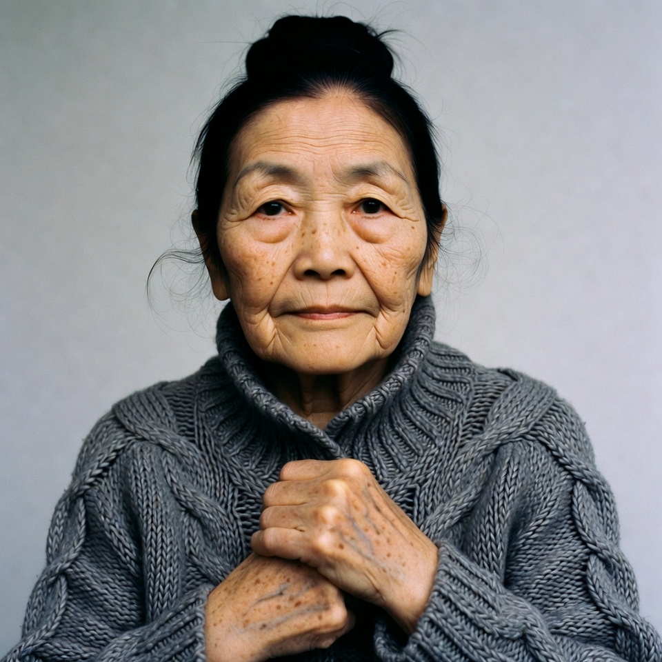 An elderly Asian woman with black hair in a bun gazes at the camera against a plain gray background. She wears a gray cable-knit turtleneck sweater and holds her hands clasped together at her chest. Her face shows wrinkles and age spots, with a calm expression.