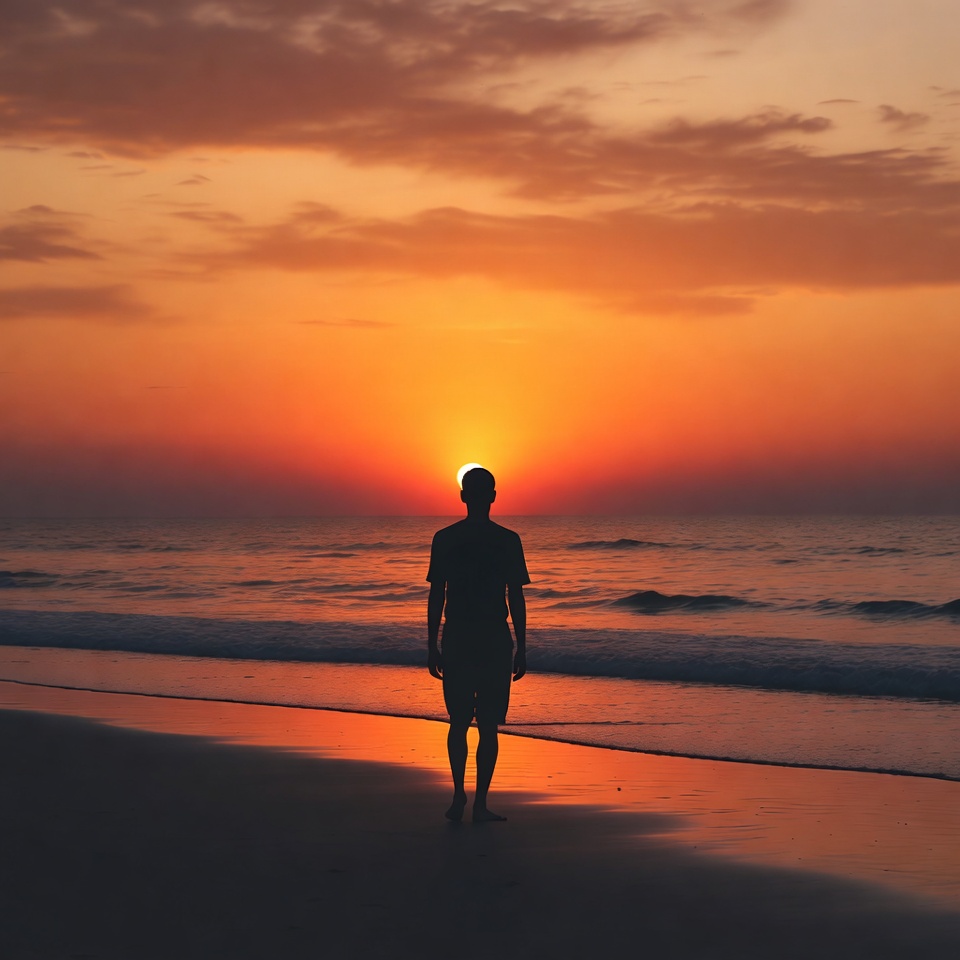 A silhouette of a man stands barefoot on the sandy beach facing the ocean at sunset. The sun glows orange behind him with scattered clouds in the sky. Gentle waves lap at the shore in the foreground.