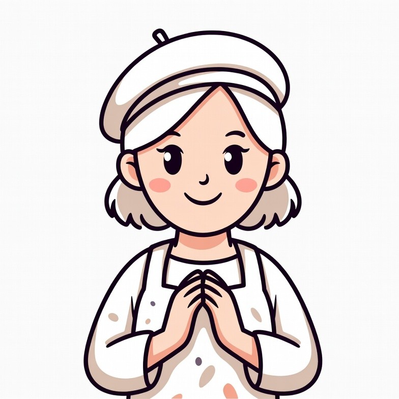A cute cartoon woman with short white hair and rosy cheeks wears a white beret and a paint-splattered white apron. She stands with hands clasped together in front, smiling happily. The illustration features a simple isolated white background.