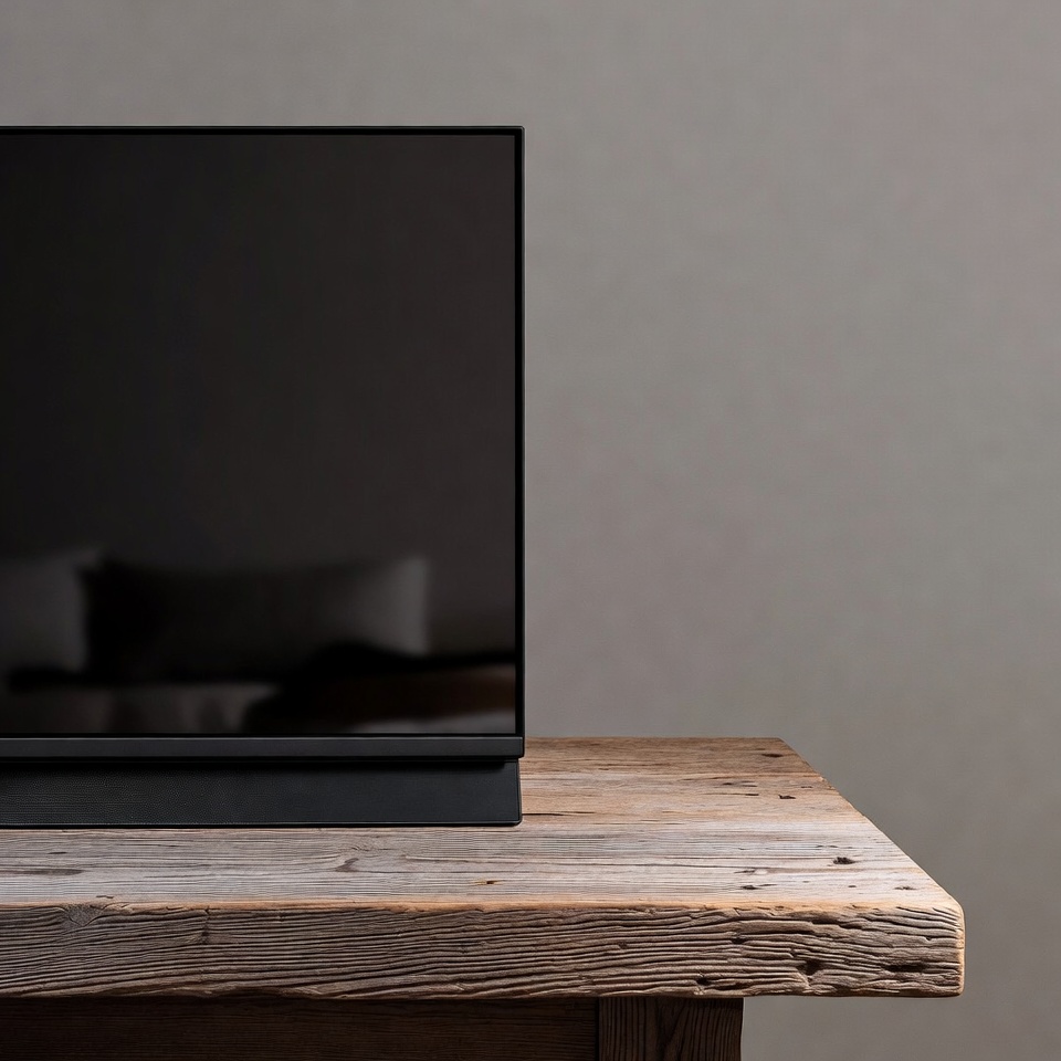 A sleek black flat-screen television stands on a rustic wooden table. The screen is off and reflects pillows faintly in the background. The setup is against a plain gray wall.