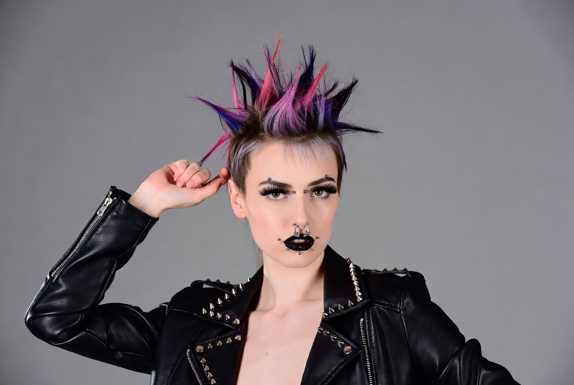 A woman with a vibrant pink and purple mohawk hairstyle poses confidently against a gray background. She wears a black leather jacket with silver studs, black lipstick, and a septum piercing. Her hand touches her hair while her expression is bold and edgy.