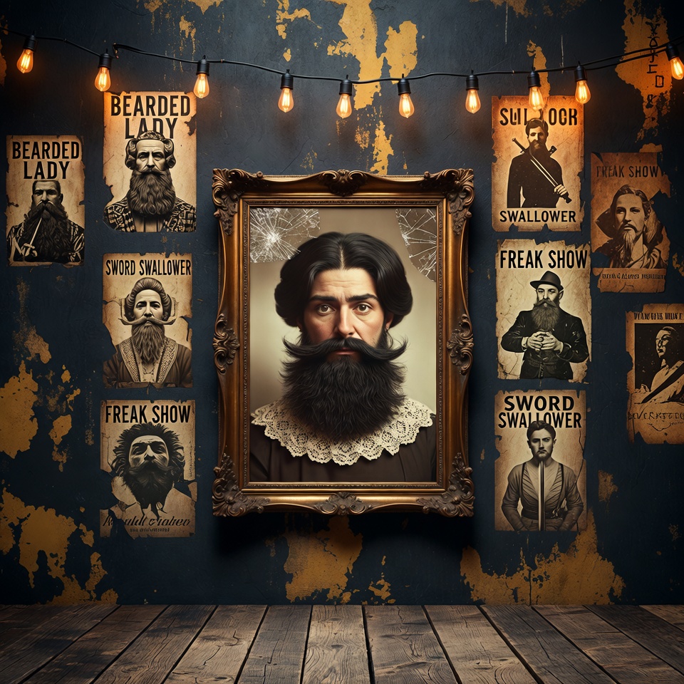 beard, bearded lady, distressed wall, fairy lights, frame, freak show, illustration, isolated background, mustache, portrait, sword swallower, vintage posters, wooden floor, bearded man