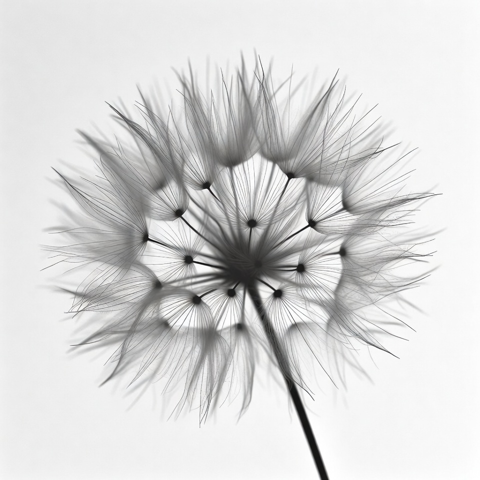 black and white, botany, closeup, dandelion seeds, flower, fluffy dandelion, isolated, macro, monochrome, nature, plant, seed head, stem, white background, wildflower, dandelion