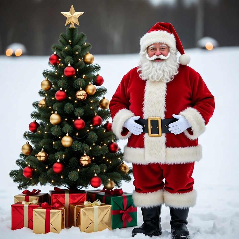 Santa Claus in a red velvet suit with white fur trim stands smiling next to a decorated Christmas tree outdoors in the snow. The tree is adorned with red and gold ornaments, lights, and a golden star on top. Colorful gift boxes are stacked at the base of the tree.