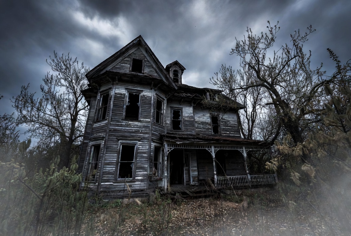 Victorian house, barren trees, broken windows, dark clouds, decay, dilapidated building, eerie, foggy woods, haunted house, isolated background, mist, old mansion, overgrown weeds, porch, rural decay, spooky architecture, turret, weathered wood, abandoned house