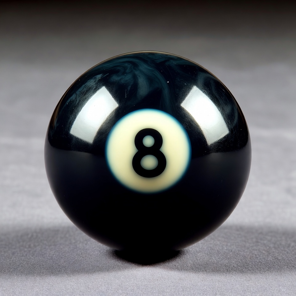 A glossy black 8-ball from a pool game sits on a dark gray surface. The ball features a white '8' numeral prominently centered on its front. Swirling dark patterns and reflective highlights are visible on its shiny surface.