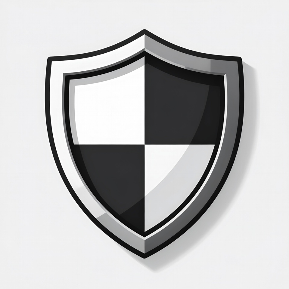 A simple vector illustration of a shield with a black and white checkered pattern. The shield features a bold metallic silver outline and subtle drop shadow on a transparent background. It is divided into four equal quadrants alternating between black and white.
