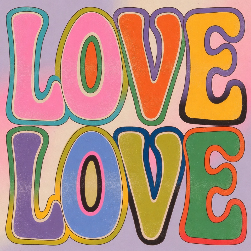 70s style, blue hues, bold letters, clipart, colorful love, green gradients, groovy font, illustration, isolated background, orange outlines, pink letters, psychedelic art, purple background, vibrant colors, yellow accents, love text