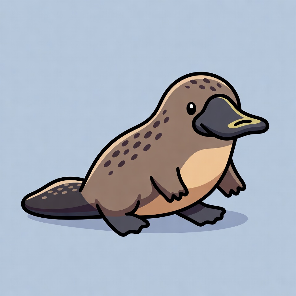 A cute cartoon platypus stands on a light blue isolated background. It features brown fur with black dots, a wide black bill, small black eyes, and webbed feet. The chibi-style animal has a plump body and a flat tail.