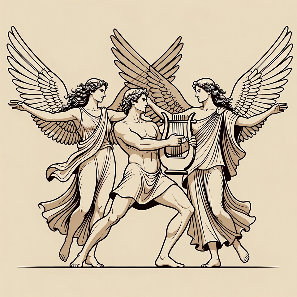 Greek mythology, ancient Greece, angels, art print, artistic illustration, beige drawing, classical art, draped garments, dynamic pose, female, flowing robes, goddesses, gods, illustration, isolated background, line art, lyre, male, muscular man, muses, music instrument, mythology, vector style, winged figures, wings, Apollo