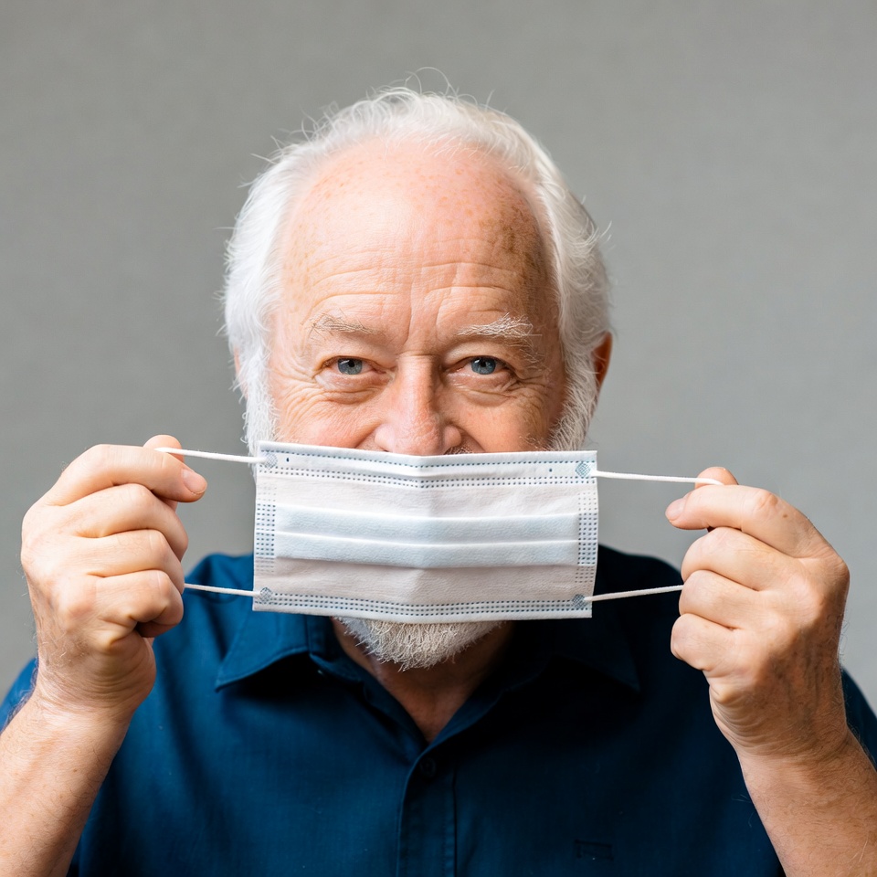 White, beard, blue shirt, face mask, gray background, hands holding, holding mask, male, old man, protective mask, senior citizen, smiling, surgical mask, white hair, elderly man