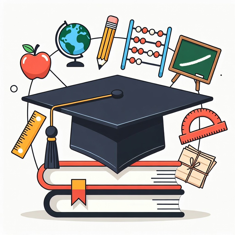 A black graduation cap sits atop stacked books in a colorful illustration. Surrounding it are school items including a red apple, globe, pencils, ruler, abacus, chalkboard, and books. The elements are arranged in a circular composition on a white background.