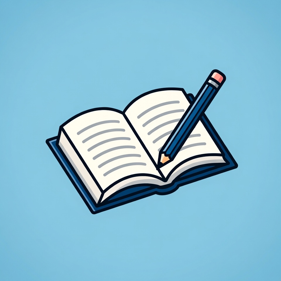 A simple clipart illustration shows an open white notebook with blue covers and lined pages on a light blue background. A blue pencil with pink eraser rests diagonally across the open pages. The notebook is viewed from above at a slight angle.