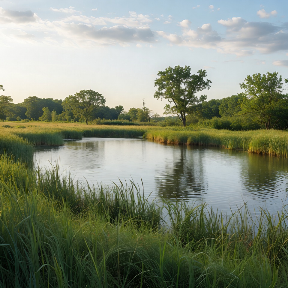 A calm river winds through tall green reeds and grass in a lush meadow surrounded by trees. The water reflects the surrounding greenery and scattered clouds in the sky. Golden sunlight illuminates the peaceful landscape during sunset.