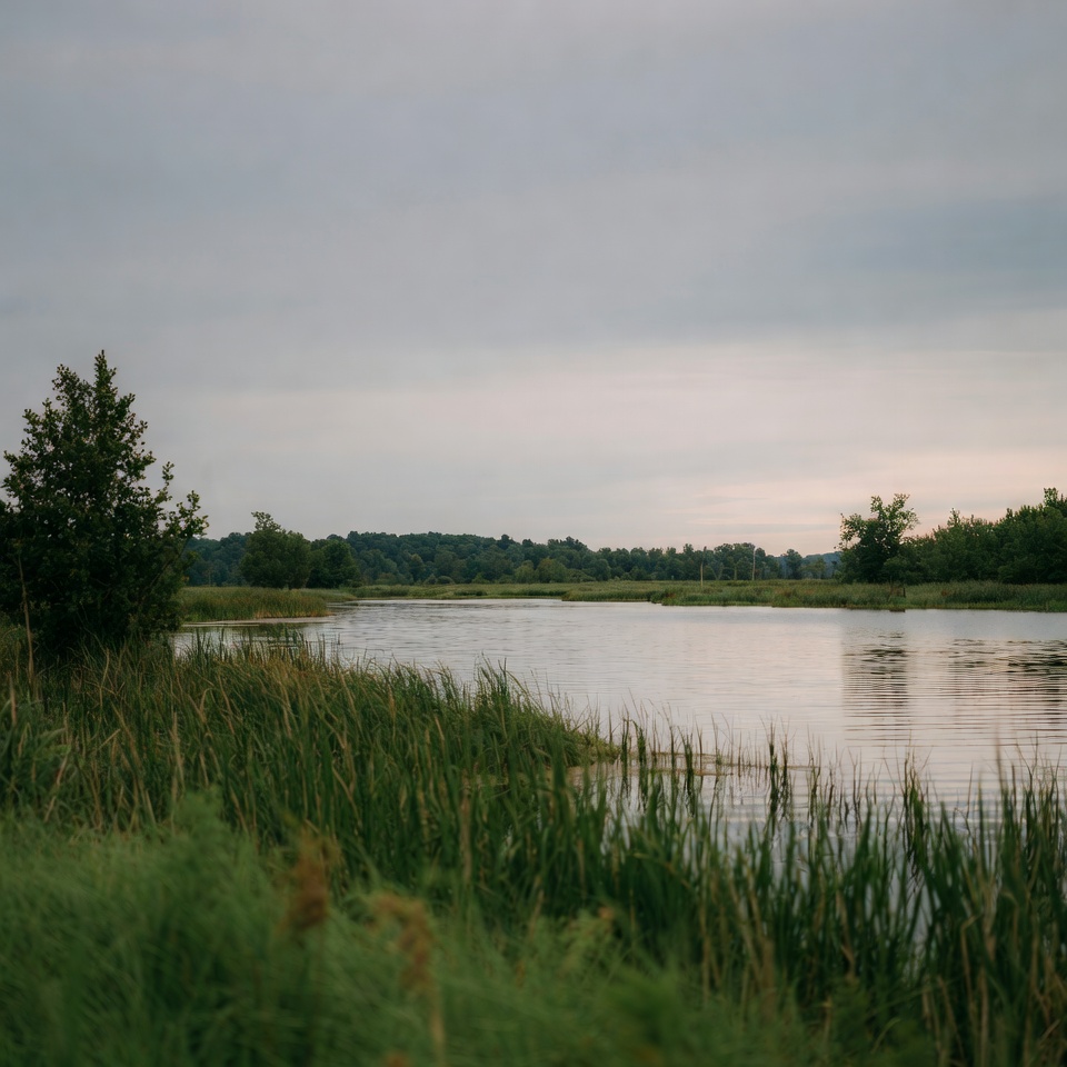 banks, bushes, calm water, cloudy sky, cloudy weather, foliage, grass, green reeds, horizon, landscape, marsh, natural scenery, nature, overcast sky, reeds, reflections, riparian, riverbank, serene landscape, trees, vegetation, water, waterway, wetlands, river