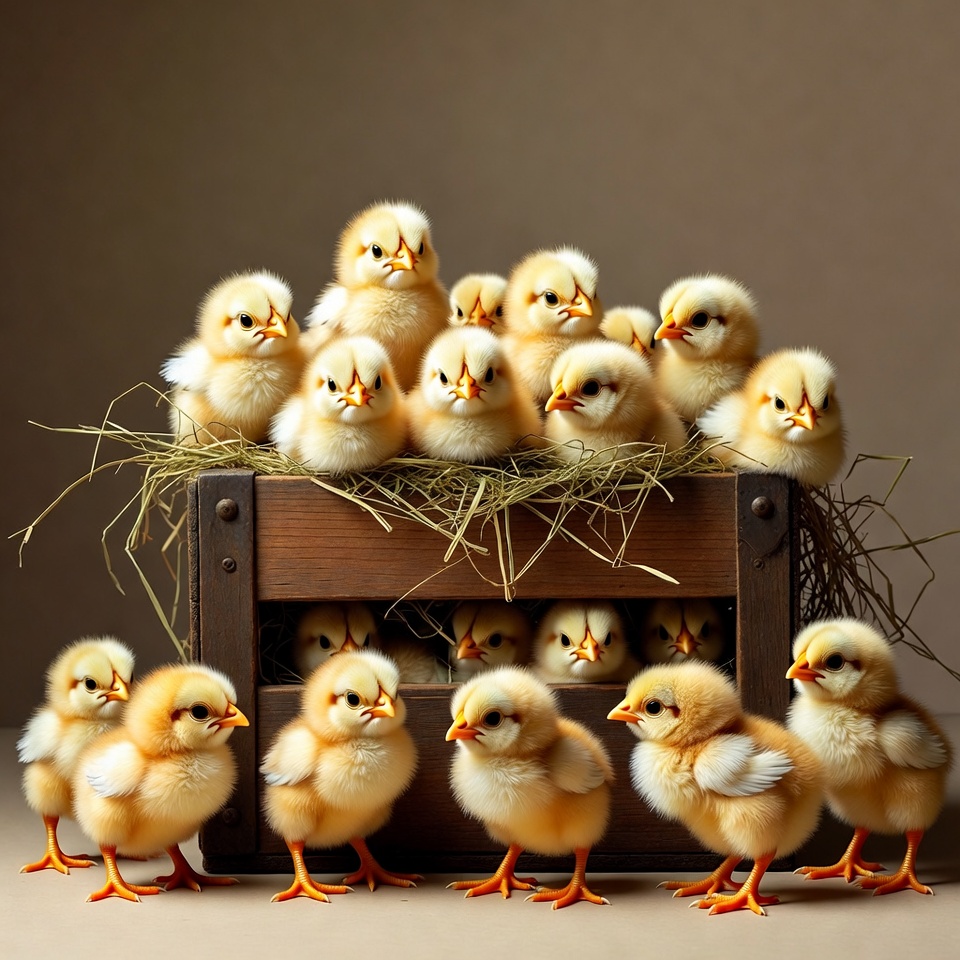 Numerous fluffy yellow baby chicks crowd inside a rustic wooden crate filled with straw. They stand closely together with some peeking over the edges and others at the bottom. The scene is set against a neutral beige background.