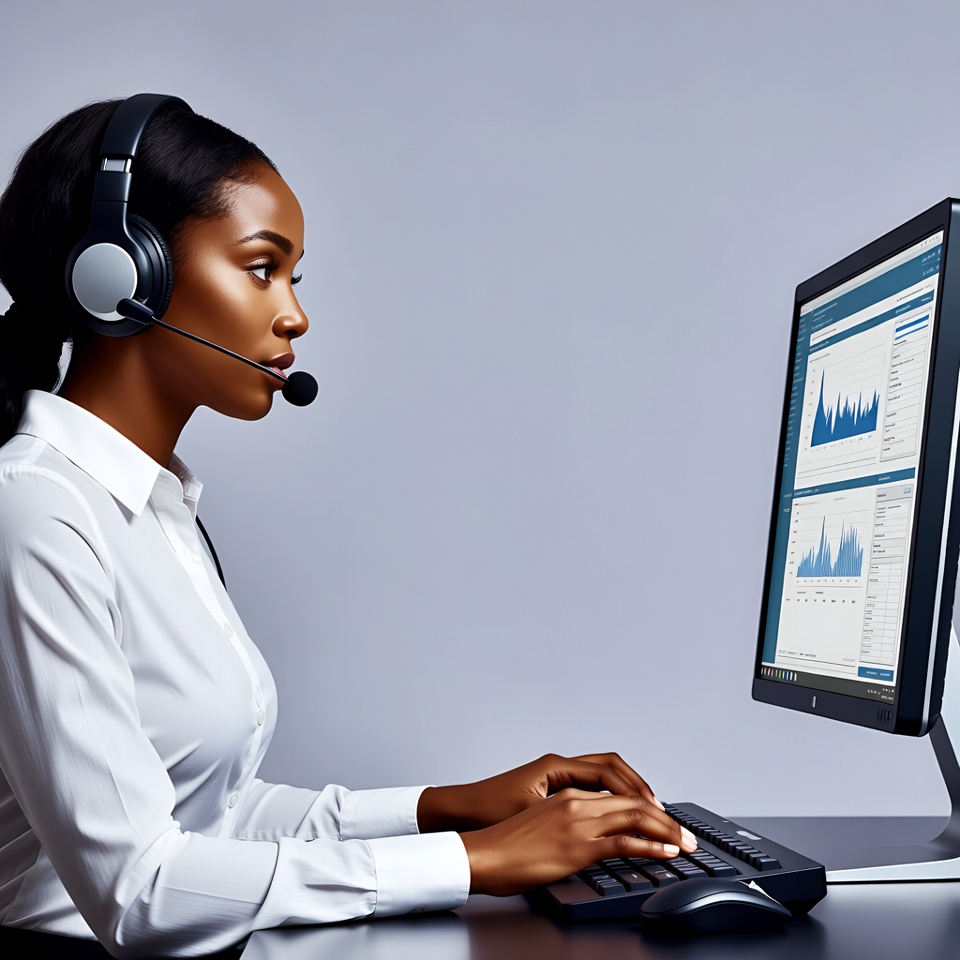 An African-American woman with long braided hair wears a white blouse and blue headset while working at a desk. She faces a large computer monitor displaying colorful charts and graphs. Her hands are positioned on the black keyboard in a professional office setting with a gray background.
