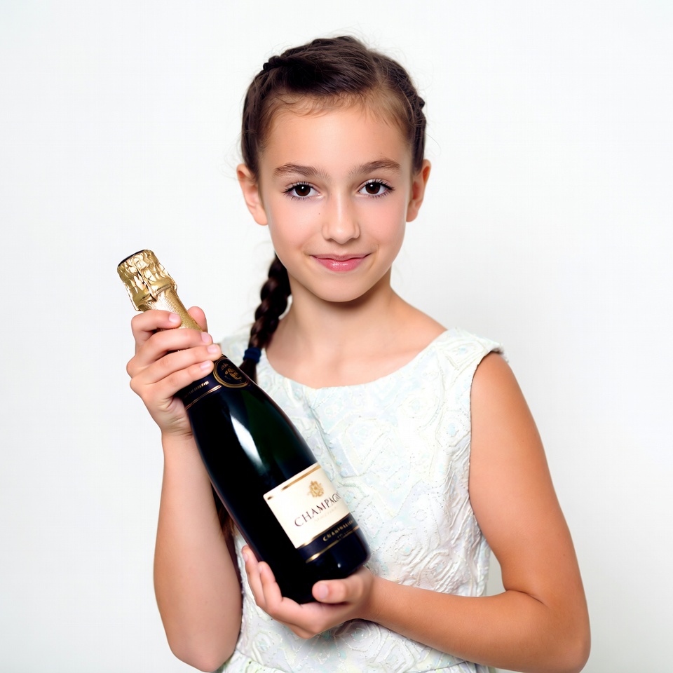 A young girl with brown hair in braids smiles while holding a bottle of champagne. She wears a light-colored sleeveless dress and stands against a white background. The bottle is labeled 'Champagne' with a gold foil top.