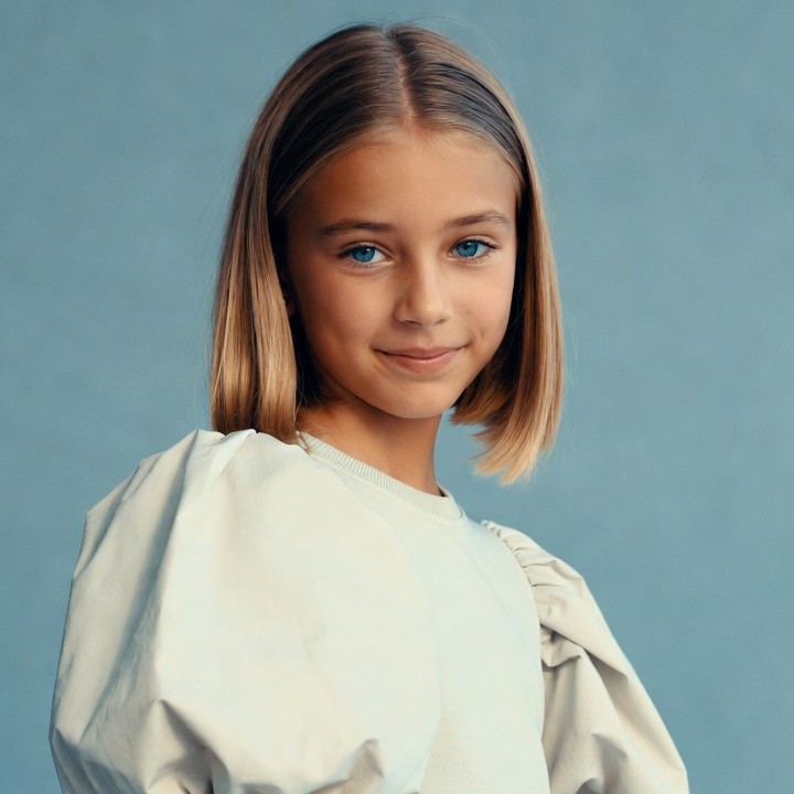 A young girl with straight blonde hair and blue eyes smiles at the camera against a solid blue background. She wears a light-colored crewneck sweater featuring prominent puffy sleeves. Her bob haircut frames her face neatly.