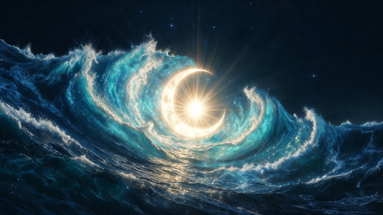 A radiant crescent moon with a bright sun-like glow emerges from swirling turquoise ocean waves at night. Stars sparkle in the dark sky above the dynamic water. The scene features a mystical, illuminated lunar form integrated with crashing waves.