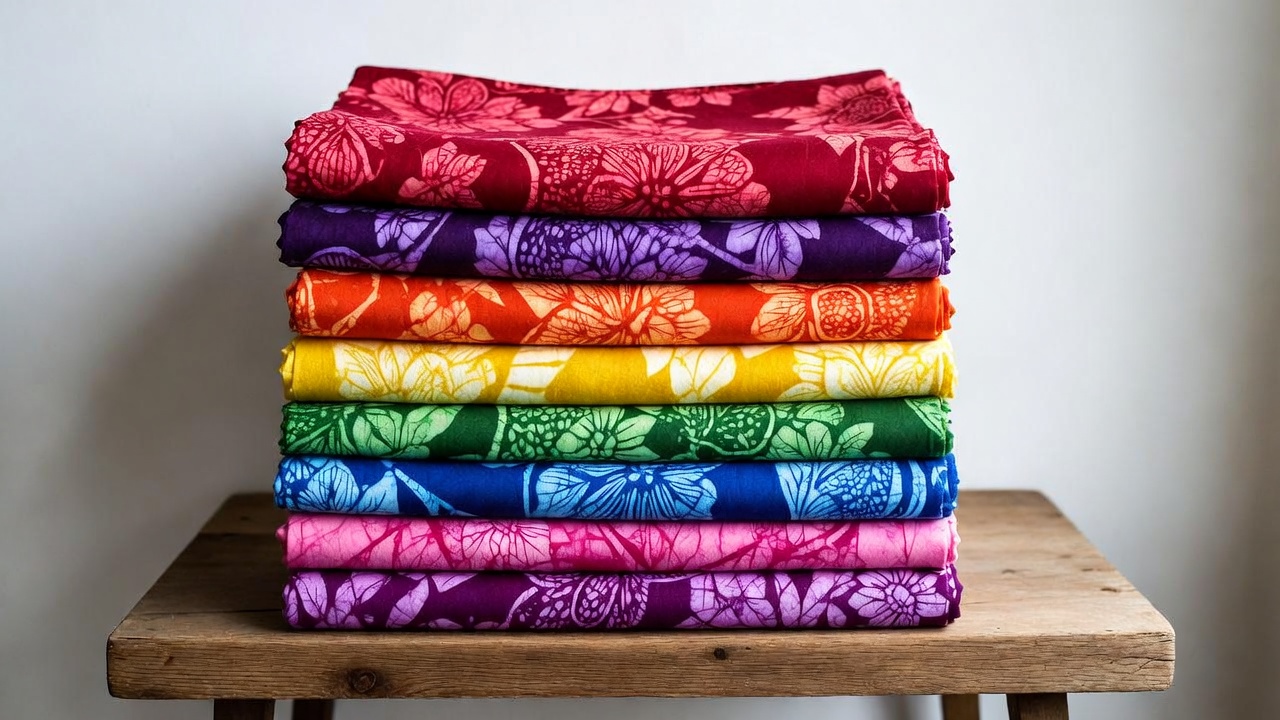 batik fabric, blue fabric, colorful cloth, cotton fabric, fabric stack, floral fabric, flower pattern, green fabric, isolated background, orange fabric, pink fabric, purple fabric, quilt fabric, red fabric, sewing fabric, textile stack, vibrant colors, wooden table, yellow fabric, rainbow fabrics