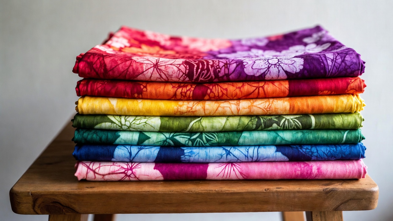A neat stack of colorful batik fabrics in rainbow hues sits on a wooden table. Each fabric layer features intricate floral patterns in shades from red and purple at the top to green, blue, and pink at the bottom. The vibrant textiles are folded precisely, showcasing their dyed designs against a neutral background.