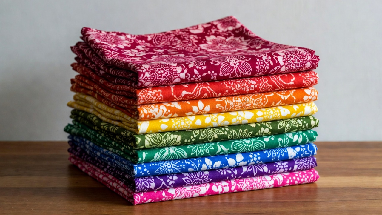 batik print, blue fabric, colorful cloth, cotton fabric, fabric stack, floral fabric, floral pattern, green fabric, isolated background, orange fabric, pink fabric, purple fabric, quilt fabric, red fabric, sewing fabric, stacked fabrics, white flowers, wood table, yellow fabric, rainbow fabrics