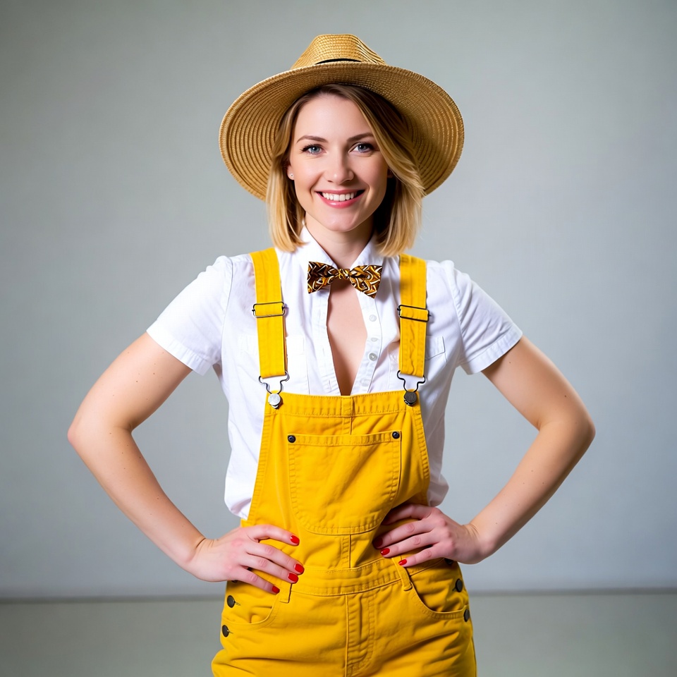 A smiling woman with shoulder-length blonde hair wears yellow overalls over a white short-sleeve shirt with a yellow bowtie. She has red nail polish on her hands placed on her hips and a wide-brim straw hat on her head. She stands confidently against a plain gray background.