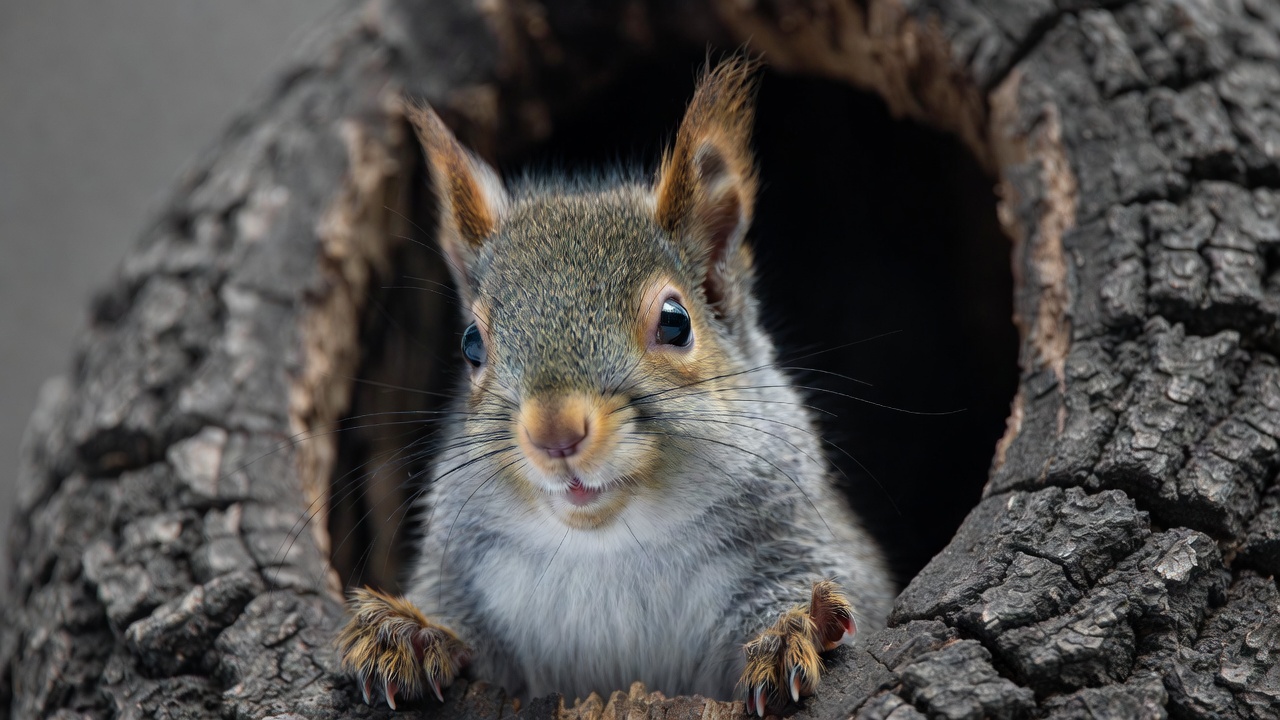 animal, bark, cute squirrel, ears, fluffy tail, forest animal, gray squirrel, isolated background, large eyes, nature, paws, peeking squirrel, rodent, tree hole, tree trunk, wildlife, squirrel