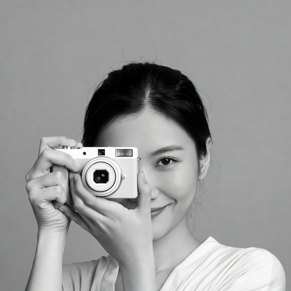 A young Asian woman with long black hair smiles while holding a white compact camera in front of her face. She peeks over the top of the camera with her eyes visible, wearing a white top. The image is set against a plain gray background.