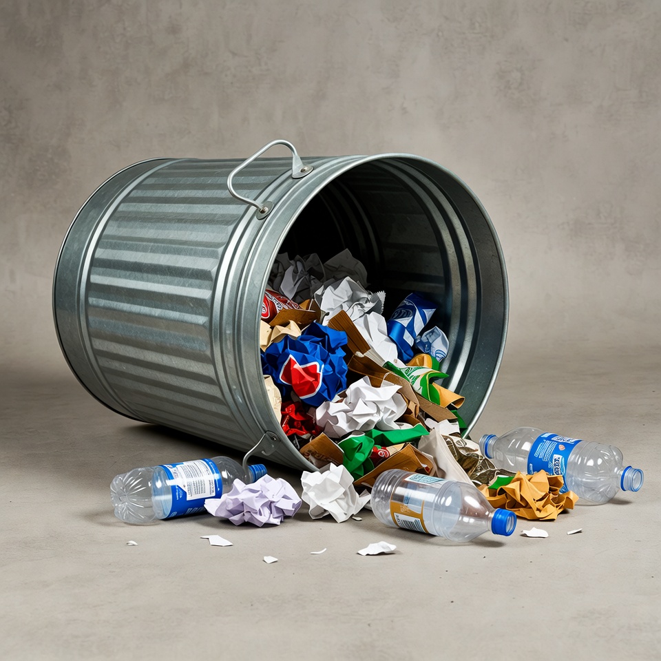 A metal trash can overflows with crumpled colored papers and plastic bottles spilling onto the gray floor. Various scraps of paper in white, blue, red, and other colors tumble out from the open top. Empty water bottles lie scattered around the base on a neutral studio background.